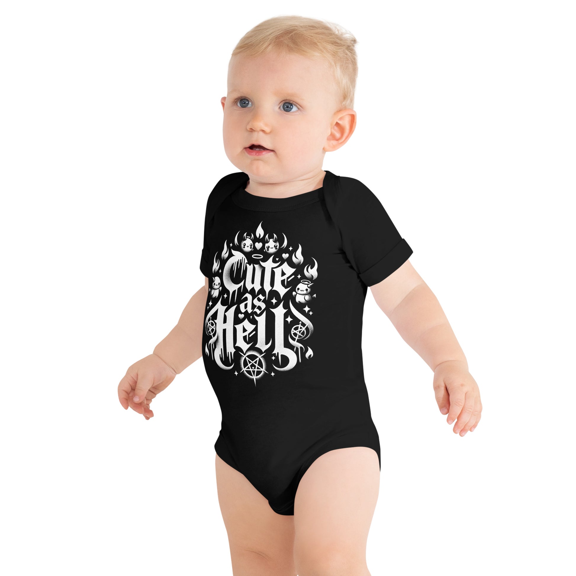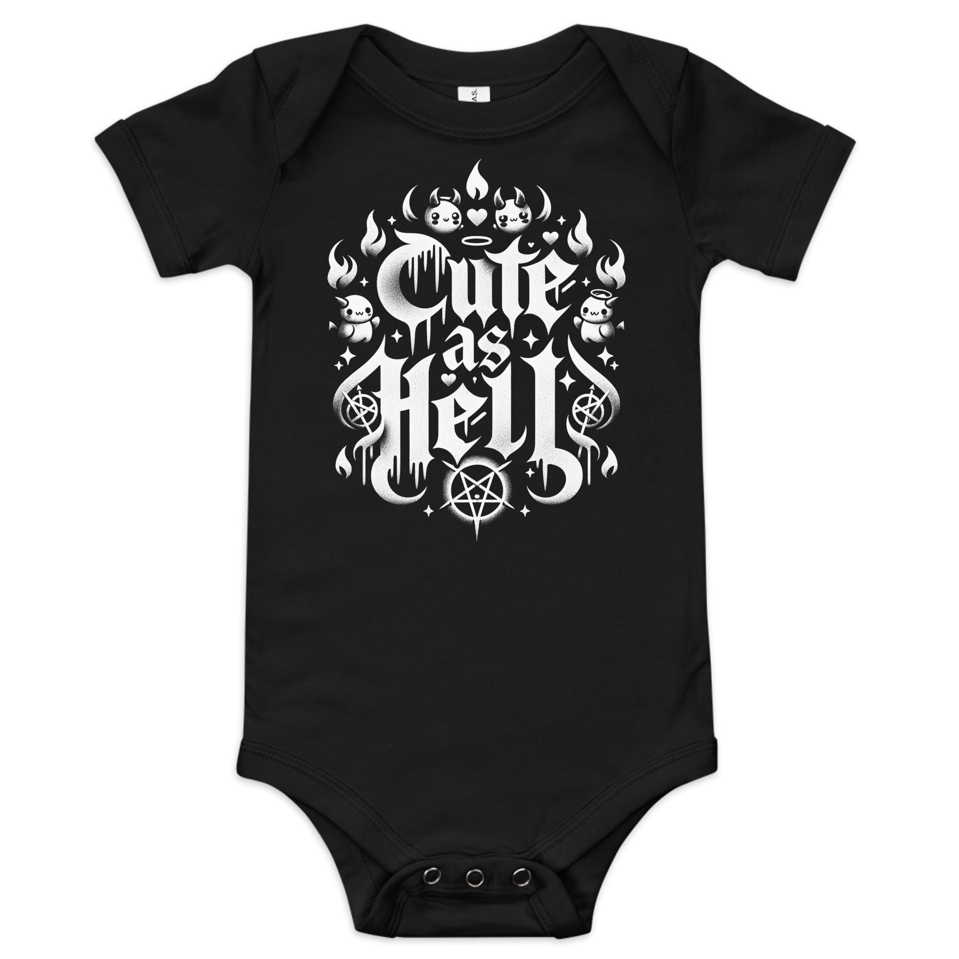 This cheeky "Cute as Hell" Baby One Piece is the ultimate expression of your little one's enchanting personality, with a soft touch and a bold, intricate design that's as adorable as a baby's giggle.
