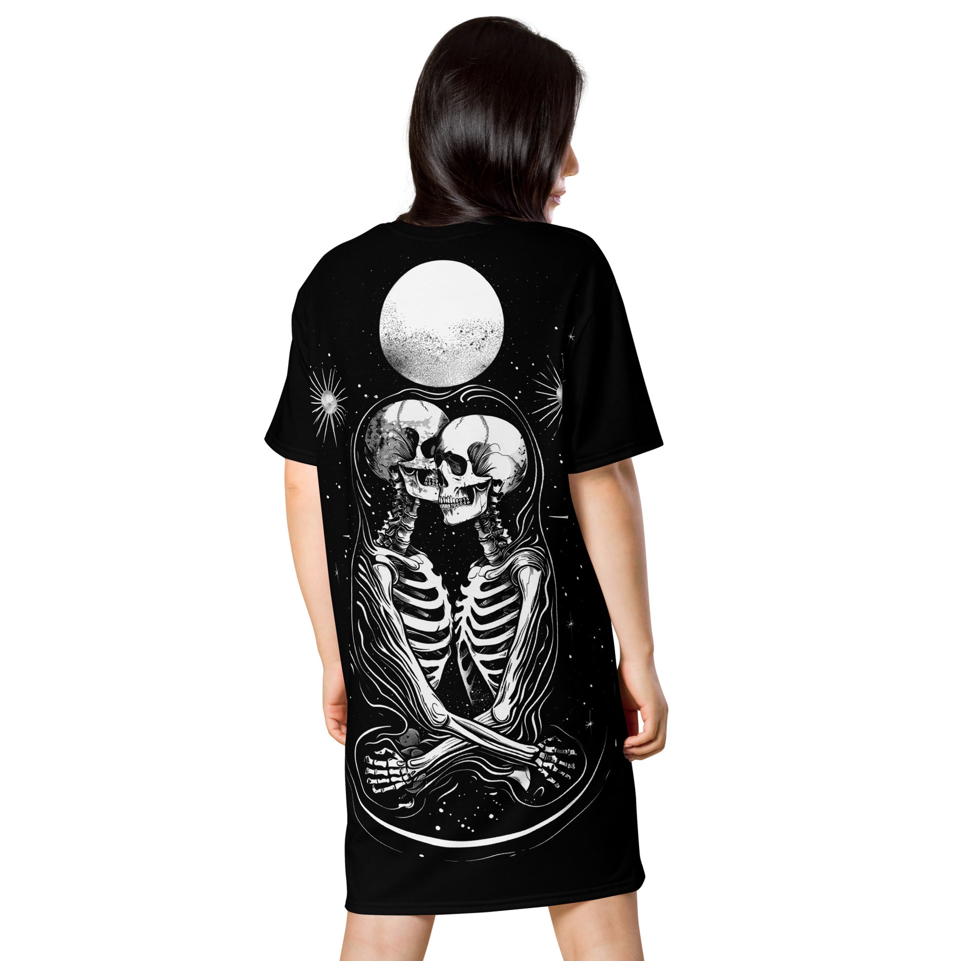 The LOVERS T-shirt dress is a soft echo of midnight's charm, a wearable slice of a dream where the stars align in a lover's rendezvous. Feel the gentle caress of darkness as it settles on your skin, a tender touch that speaks of timeless bonds.