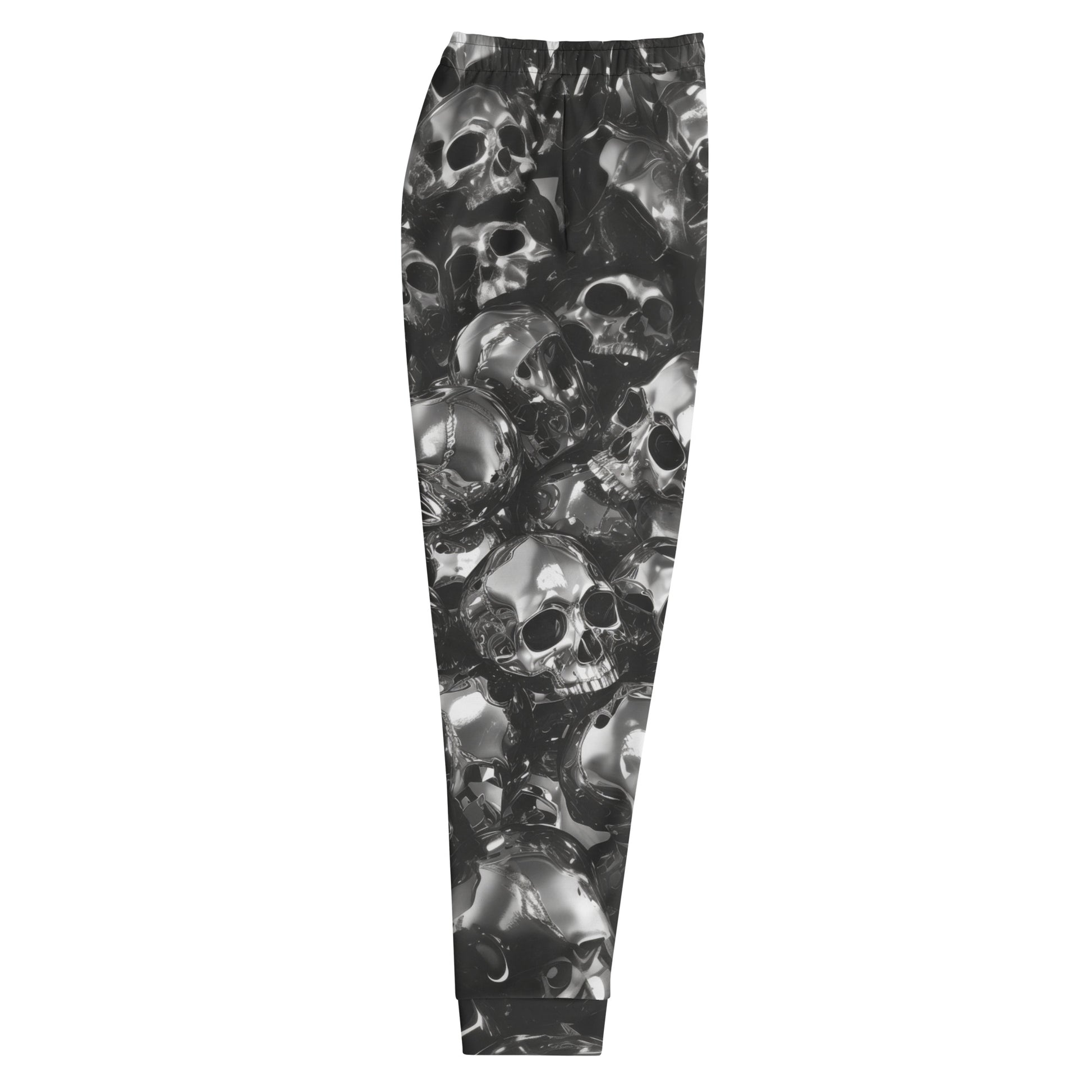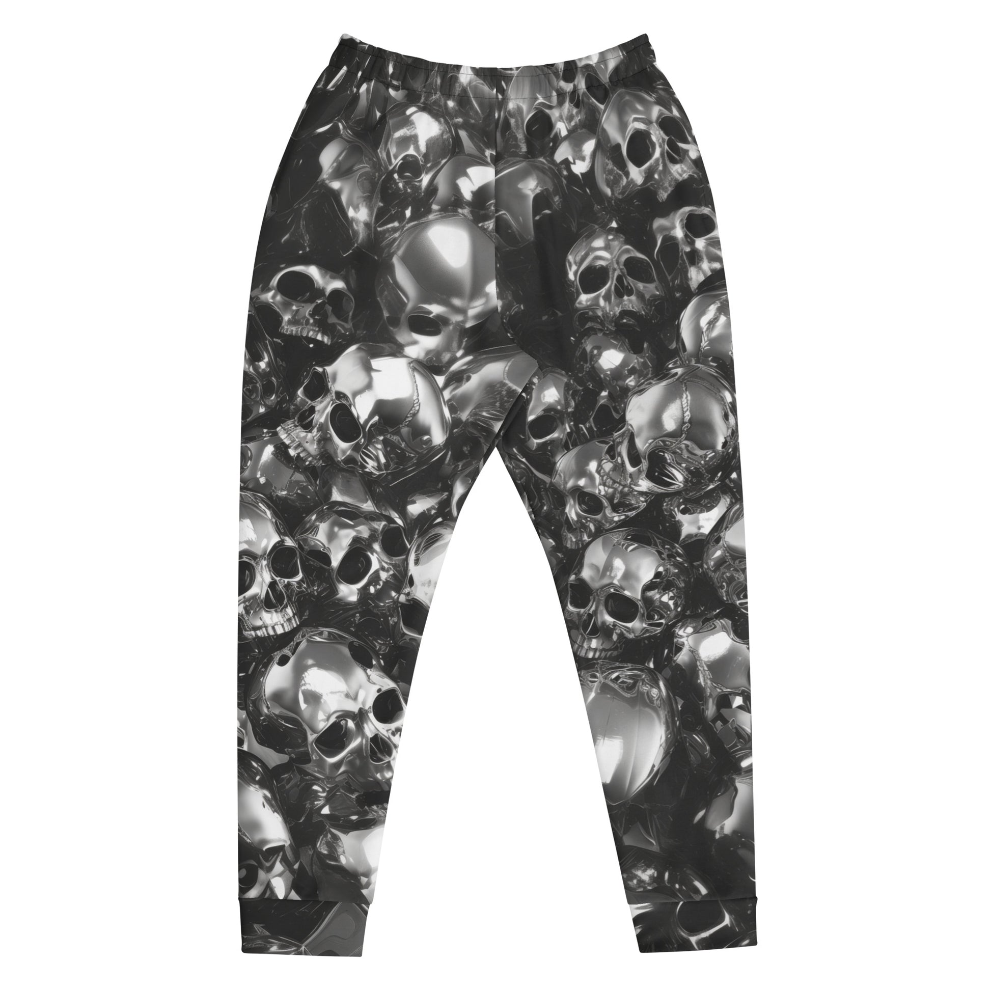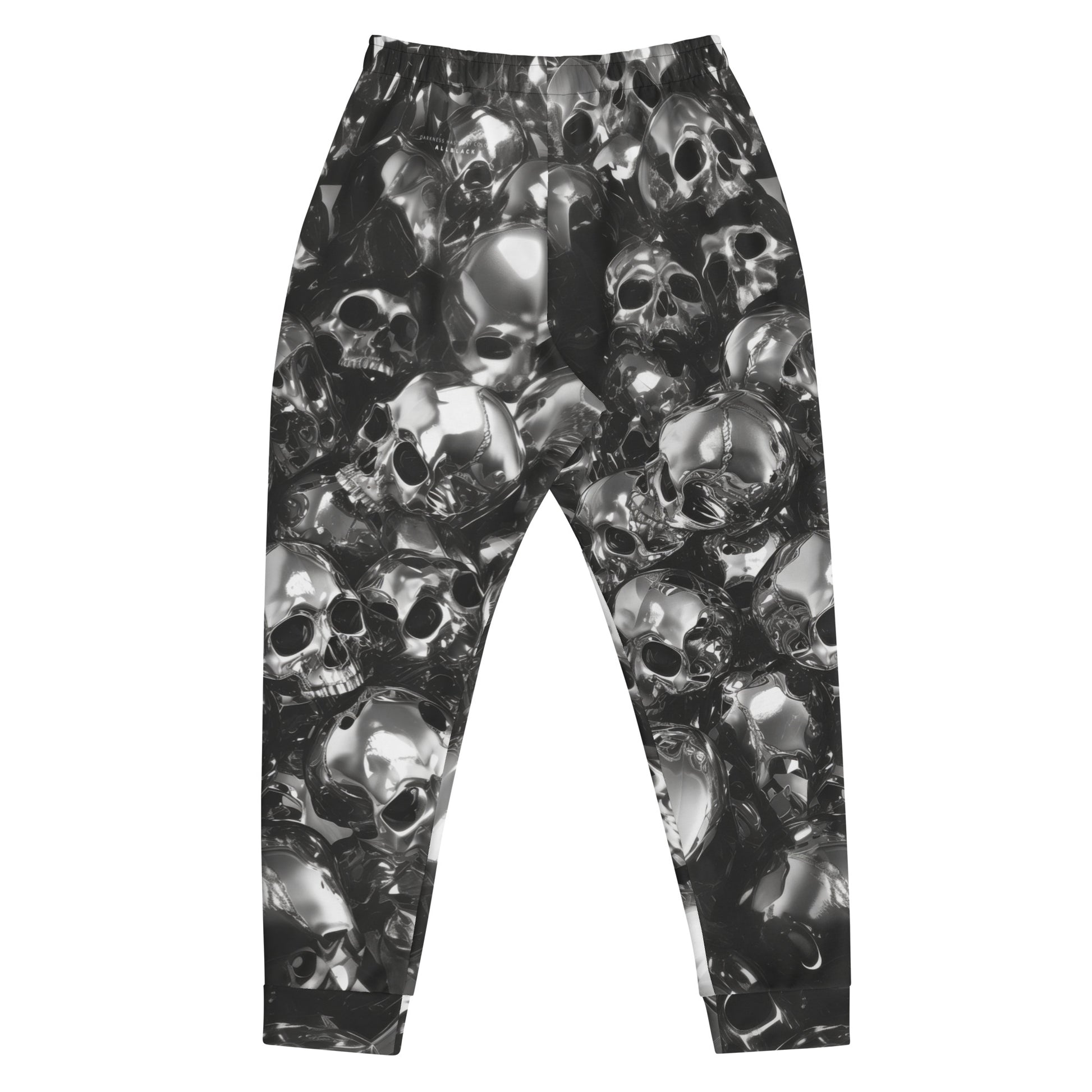 Wrap your form in these joggers, a gallery of gleaming memories, each skull a nod to the beauty of impermanence. This garment doesn't just fit; it fascinates, inviting eyes to dive deep into the well of bygone eras.