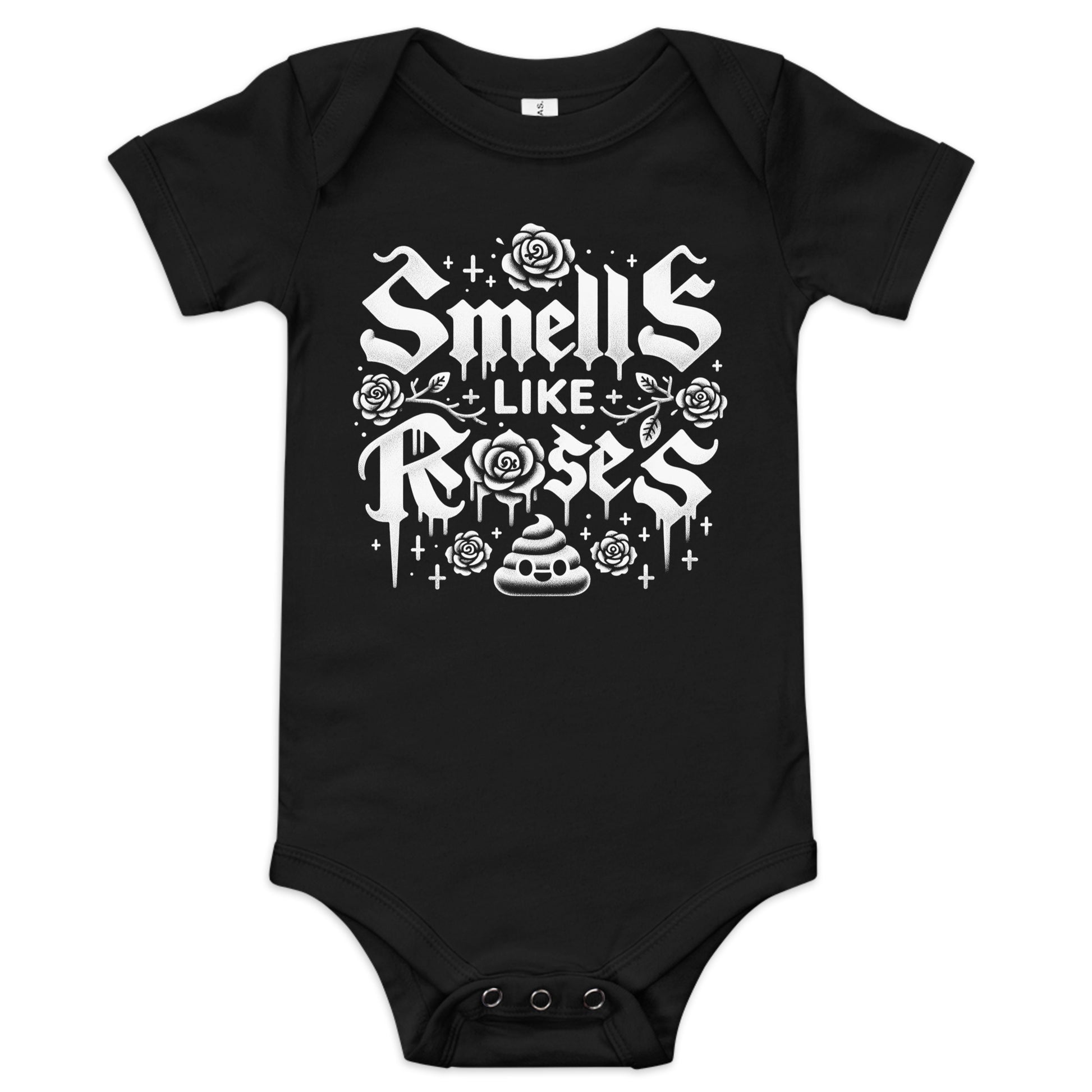 Wrap your little one in a garden of whimsy with this "Smells Like Roses" Baby One Piece. Its playful contrast of fragrant blooms and cheeky graphics on a canvas of midnight black fabric brings a smile to everyday adventures.