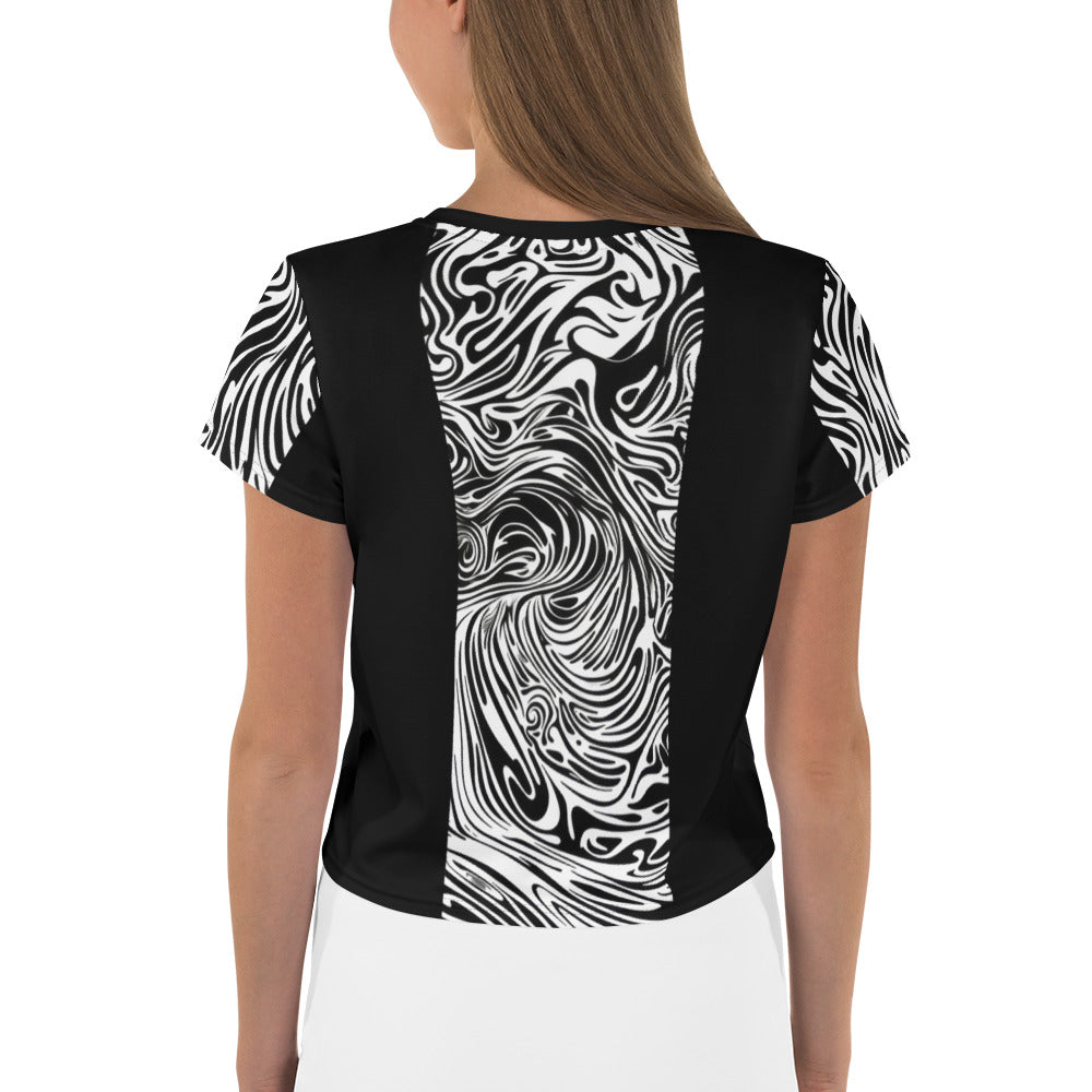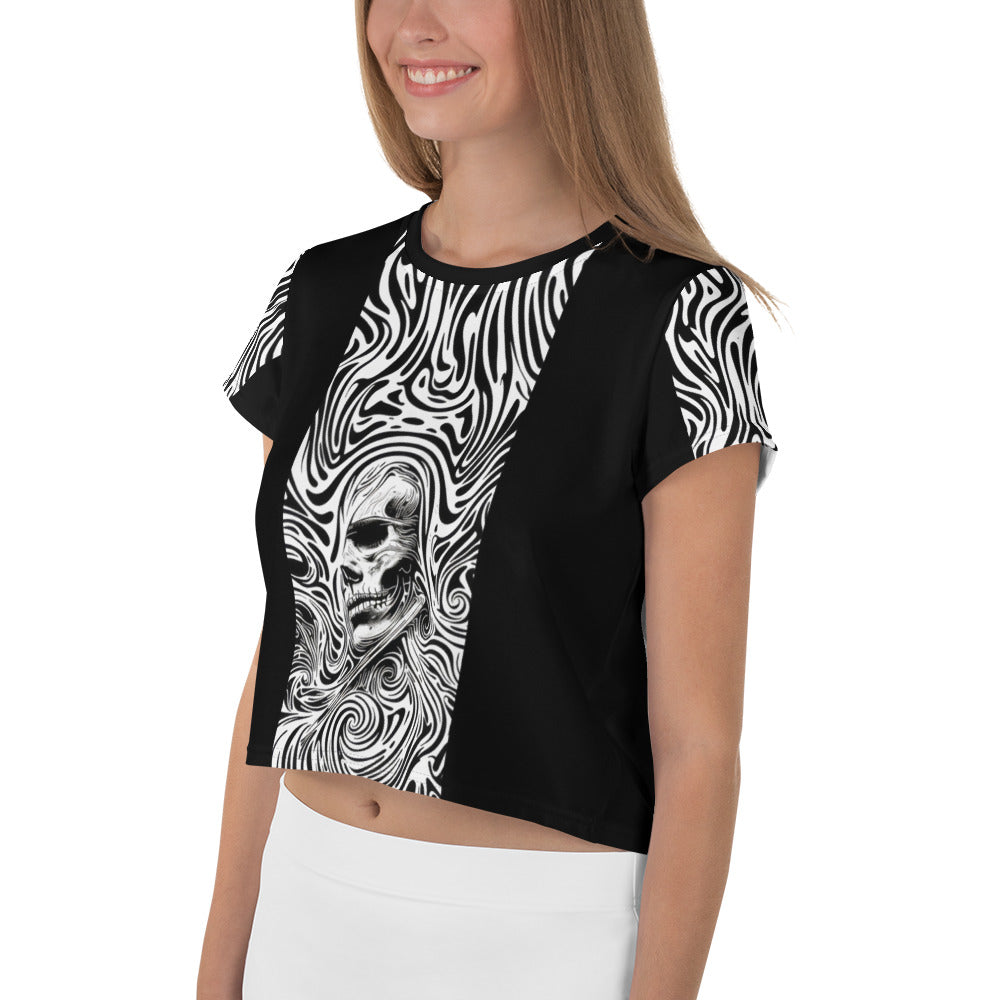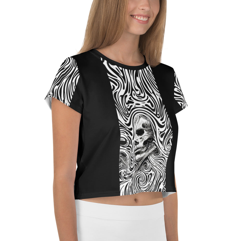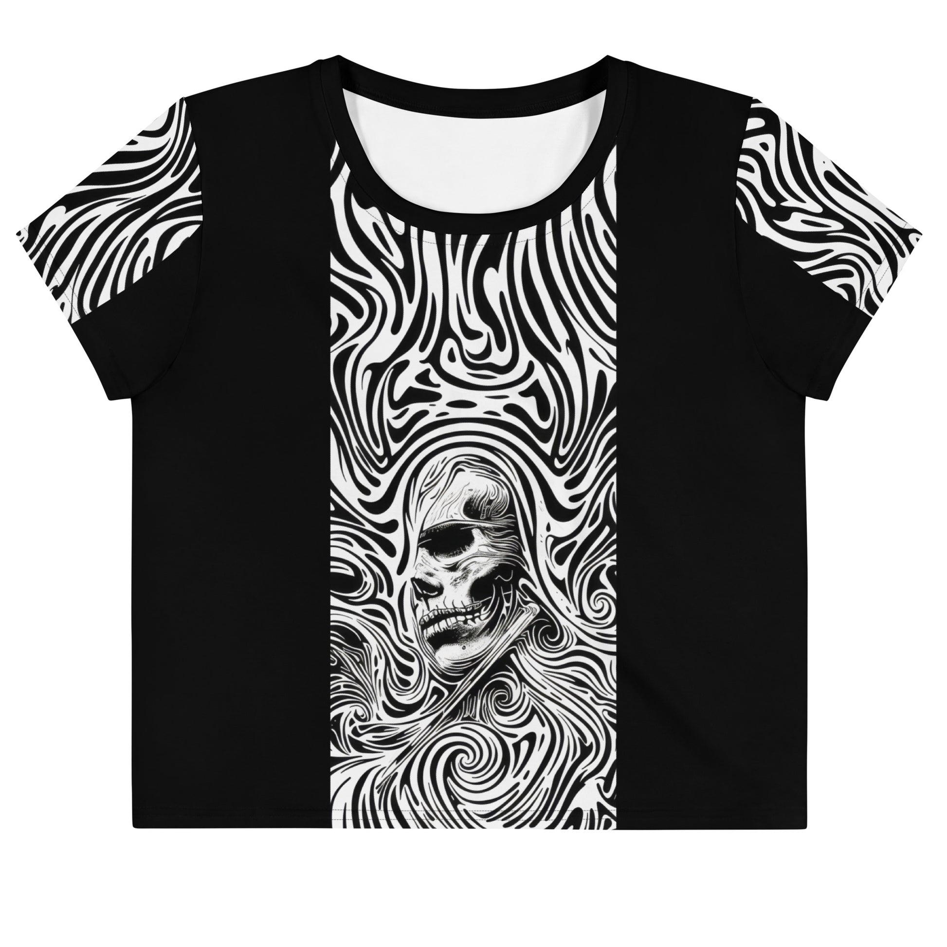 The STRIPES Crop Tee is a celebration of contrast, an ode to the patterns that pulse beneath the surface of the mundane. Clad in this, you're not simply stylish; you're a storyteller of the sartorial kind, where every line is a verse and the skull a chorus.
