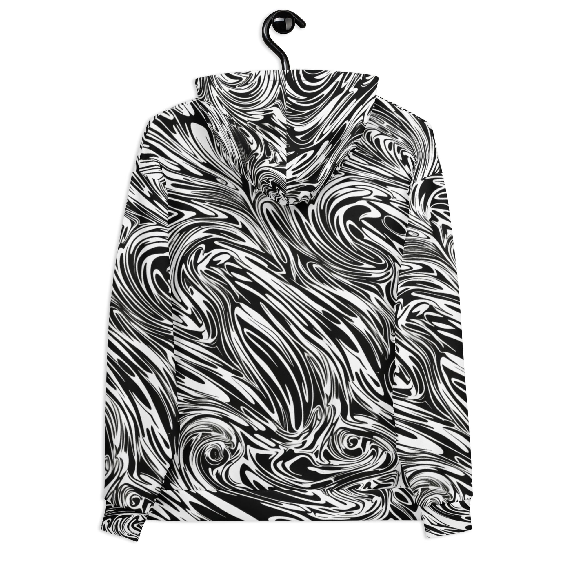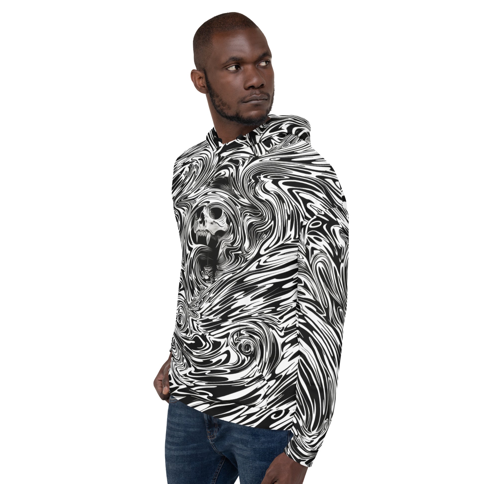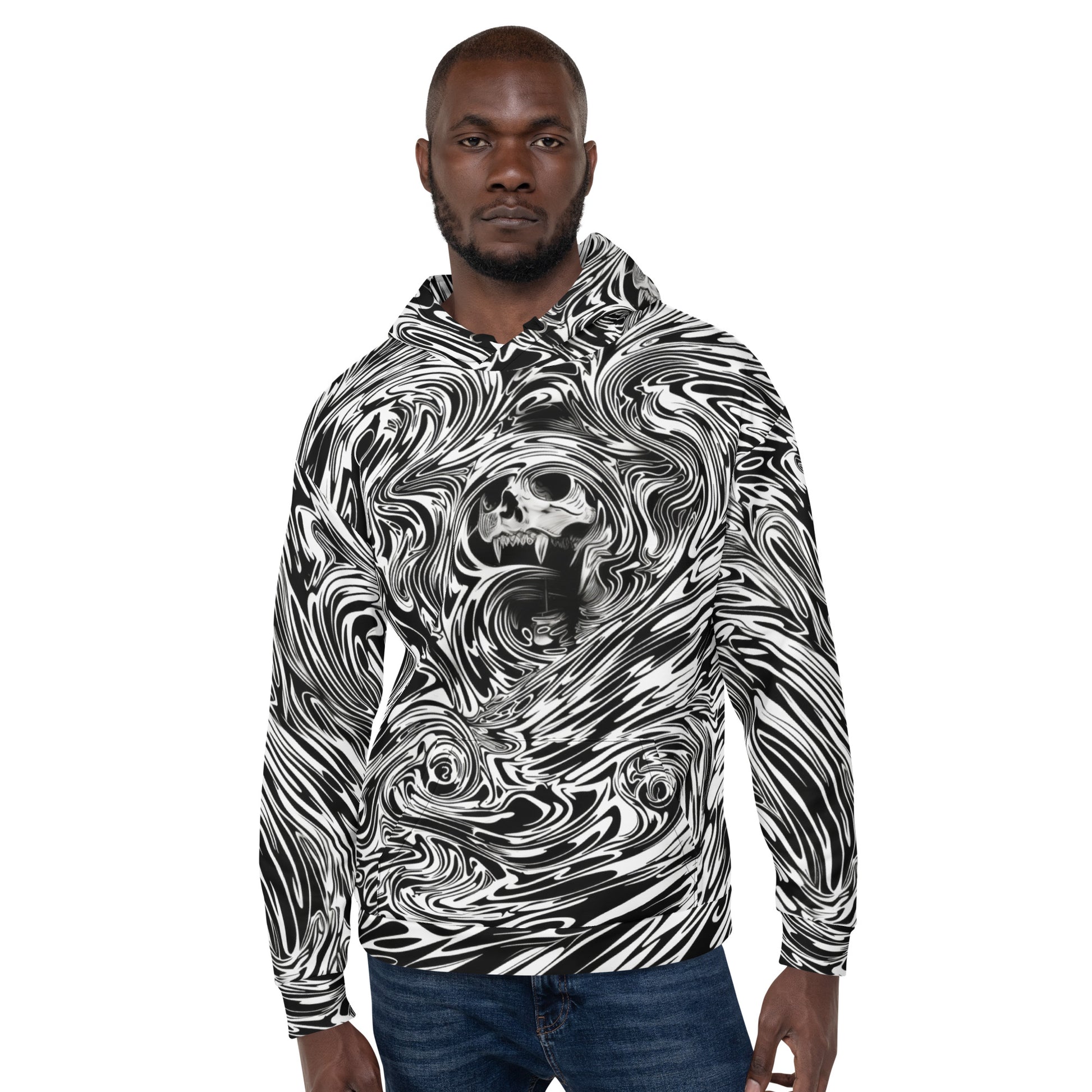 Don this hoodie and become the artist of your own dark, swirling masterpiece. The bold patterns and stark skull are not just seen but felt, creating a presence that turns sidewalks into catwalks, night or day.