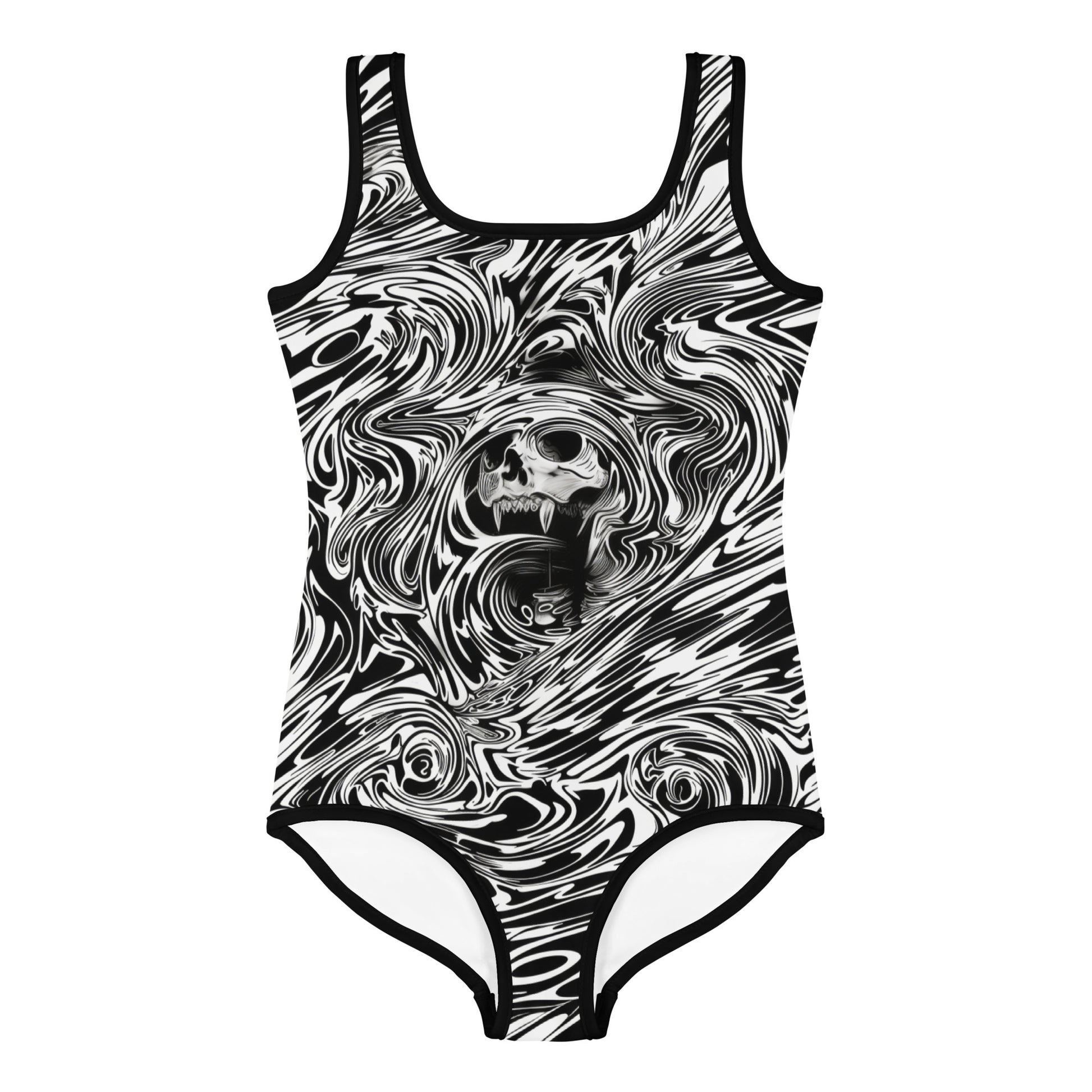 This swimsuit is a siren's call to young dreamers, a vortex of patterns drawing them into tales of old and new. The 'VAMP' kids swimsuit is for those who wear their hearts on their sleeves and their love for legends on their swimwear.
